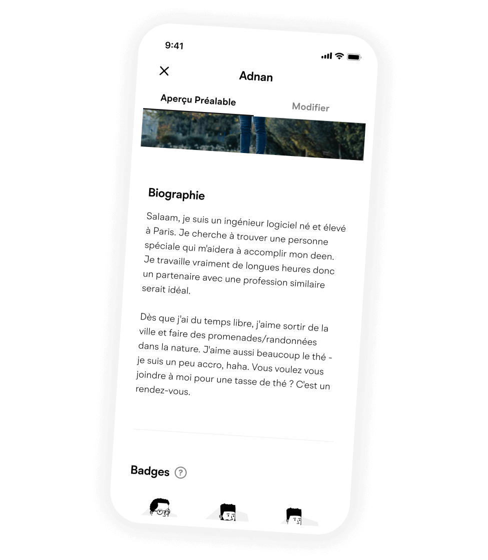 Soyez génial - Votre profil vous permet de montrer le meilleur de vous-même. Partagez ce qui vous rend unique en ajoutant des photos, des vidéos et une voix. Gardez juste les choses halal.