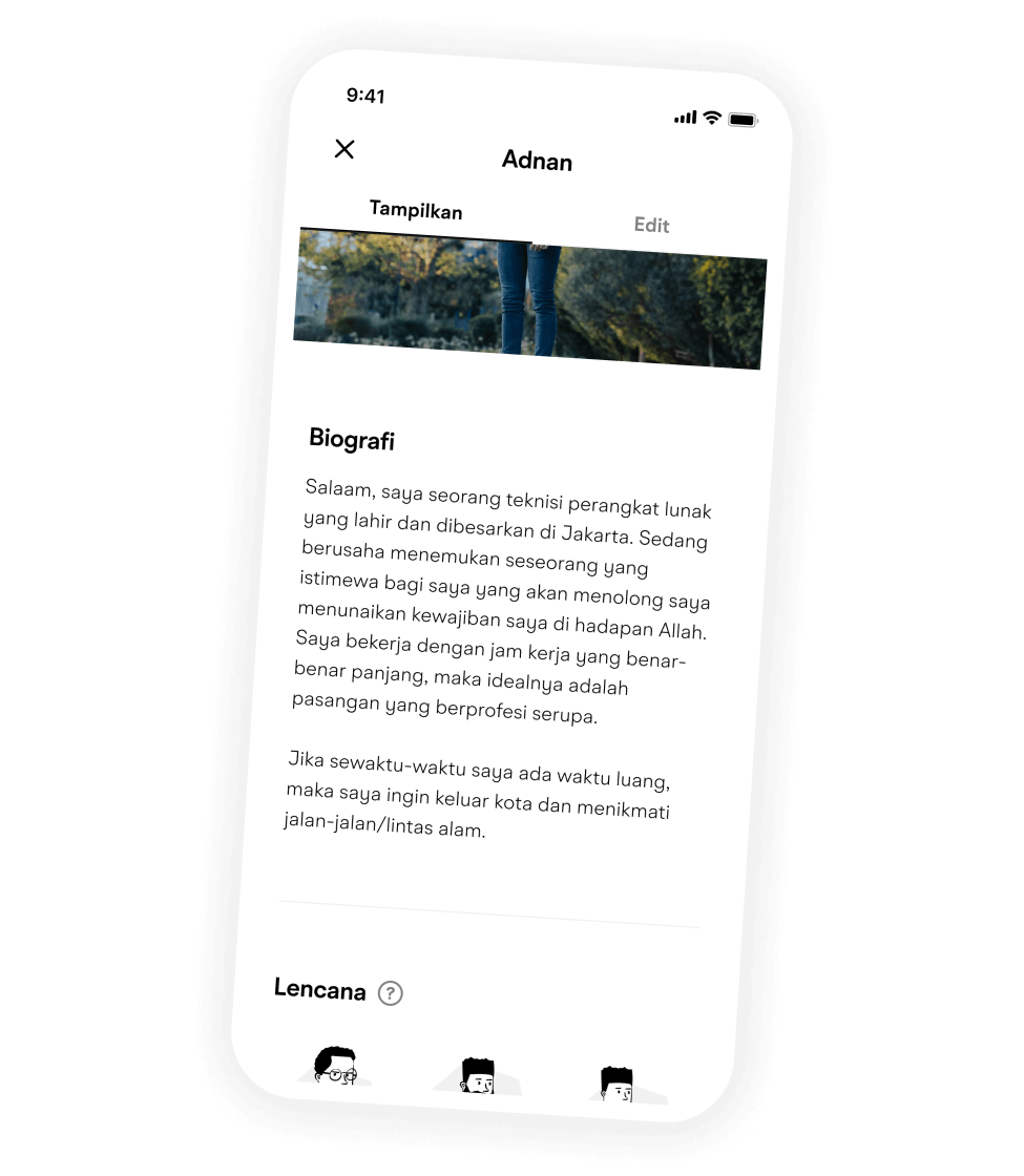 Jadilah pribadi yang mengesankan - Profil Anda memungkinkan Anda memperlihatkan sisi terbaik diri Anda. Berikan apa yang membuat Anda terlihat unik dengan cara menambahkan foto, video dan suara. Jaga agar segala sesuatunya tetap halal.
