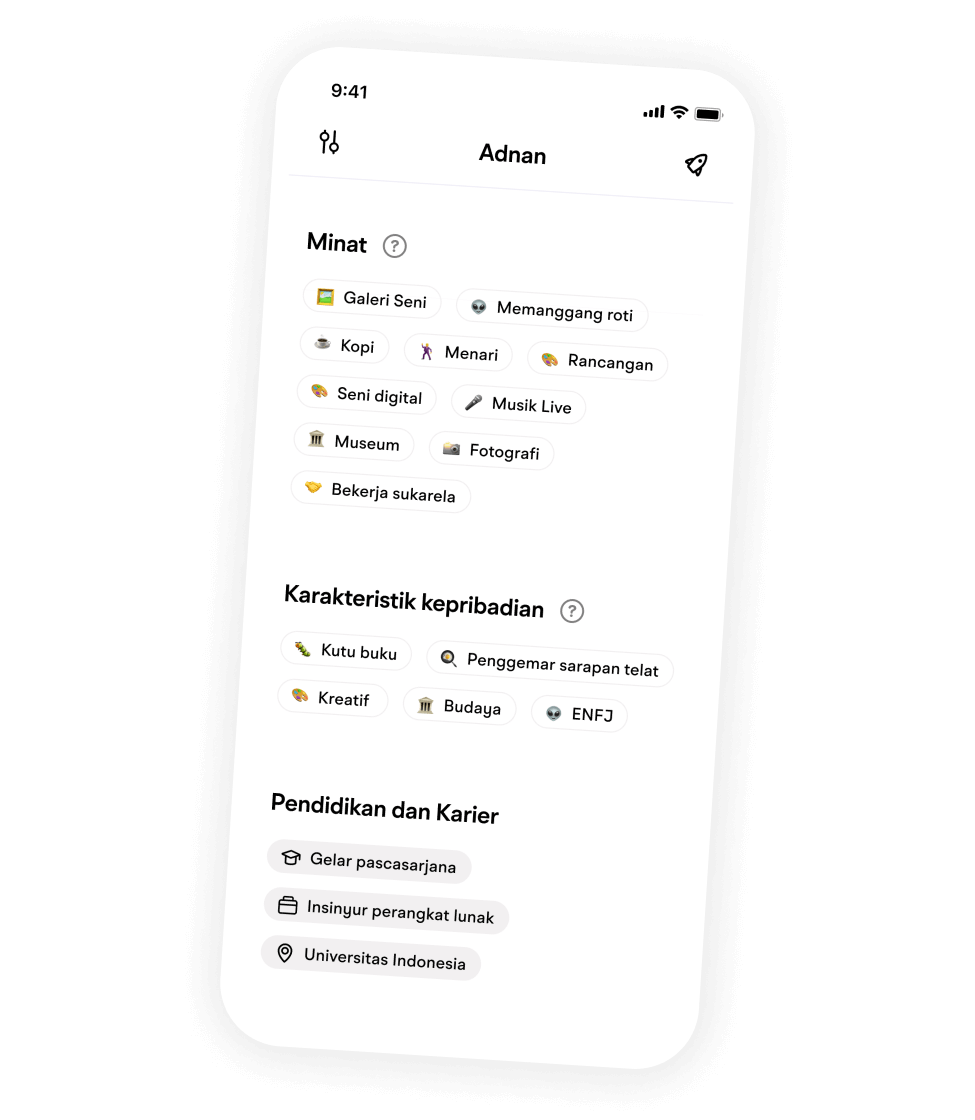 Apakah Anda seorang penggemar film? Mungkin bekerja suka rela itu penting bagi Anda? Dengan menambahkan minat dan Karakteristik Kepribadian ke profil Anda, maka akan membantu Anda menjalin hubungan dengan anggota-anggota yang mempunyai kegemaran yang sama.