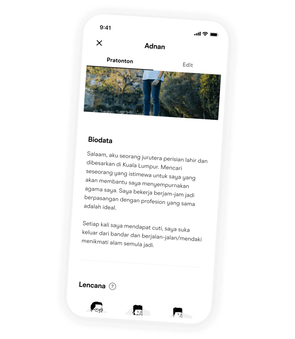 Jadi hebat - Profil anda membolehkan anda mempamerkan diri terbaik anda. Kongsi perkara yang menjadikan anda unik dengan menambah foto, video dan suara. Pastikan semuanya halal.