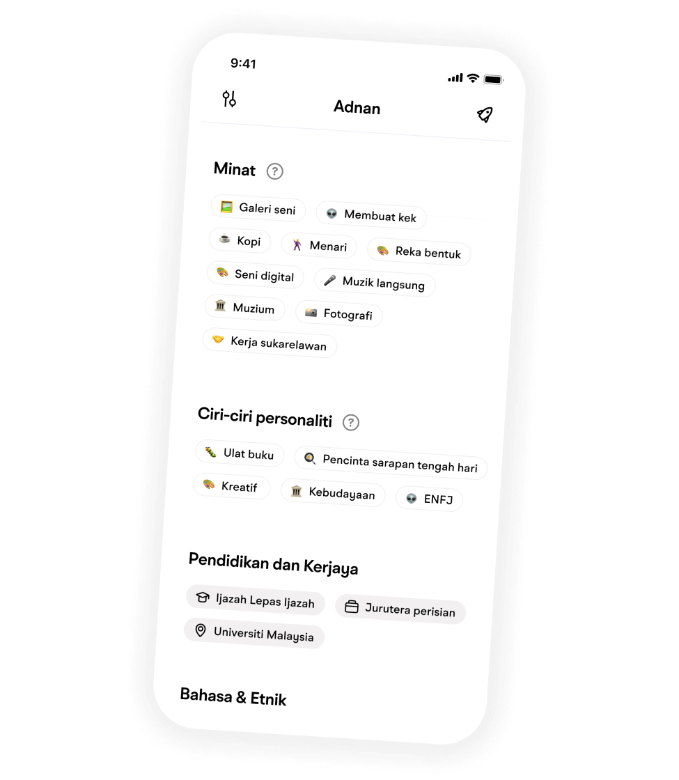 Adakah anda seorang nerda filem? Mungkin menjadi sukarelawan adalah penting kepada anda? Menambah Minat dan Ciri Personaliti pada profil anda membantu anda berhubung dengan cepat dengan ahli yang berkongsi minat anda.