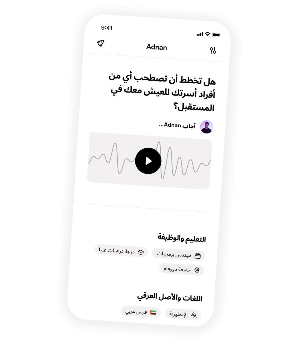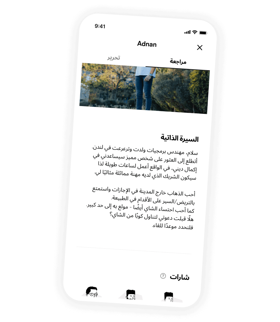 إن إضافة اسئلة التعارف إلى بروفايلك يمنح الأشخاص اللي يتطابقون معك شيئا أكثر عشان يحكوا معك في رسالتهم الأولى. يمكنك معرفة أشياء مهمة بسرعة مثل وجهات نظرهم حول الزواج، أو ما يفعلونه من أجل المتعة، أو كيف يمارسون طقوسهم الإيمانية.