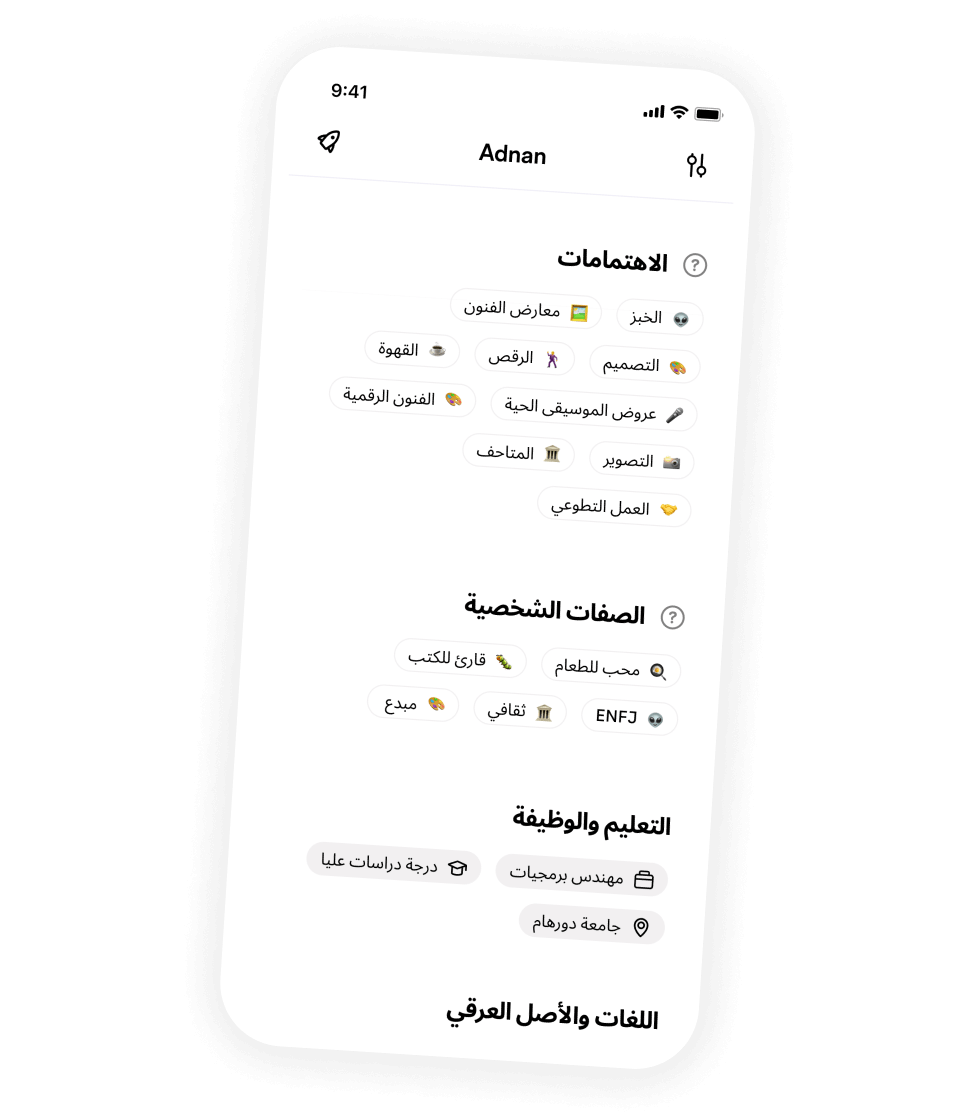 تحب الأفلام كثير؟ يمكن العمل التطوعي مهم بالنسبة لك؟ بتساعدك إضافة الاهتمامات والصفات الشخصية لبروفايلك في التواصل بسرعة مع الأعضاء الذين يشاركونك نفس الشغف.