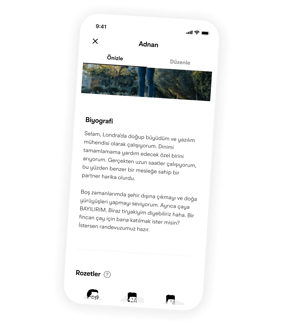 Kendiniz olun - Profiliniz, kişiliğinizin en iyi yönlerini göstermenize imkân tanır. Fotoğraflar, videolar ve sesler ekleyerek sizi benzersiz kılan özelliklerinizi paylaşın. Helal olsun yeter.