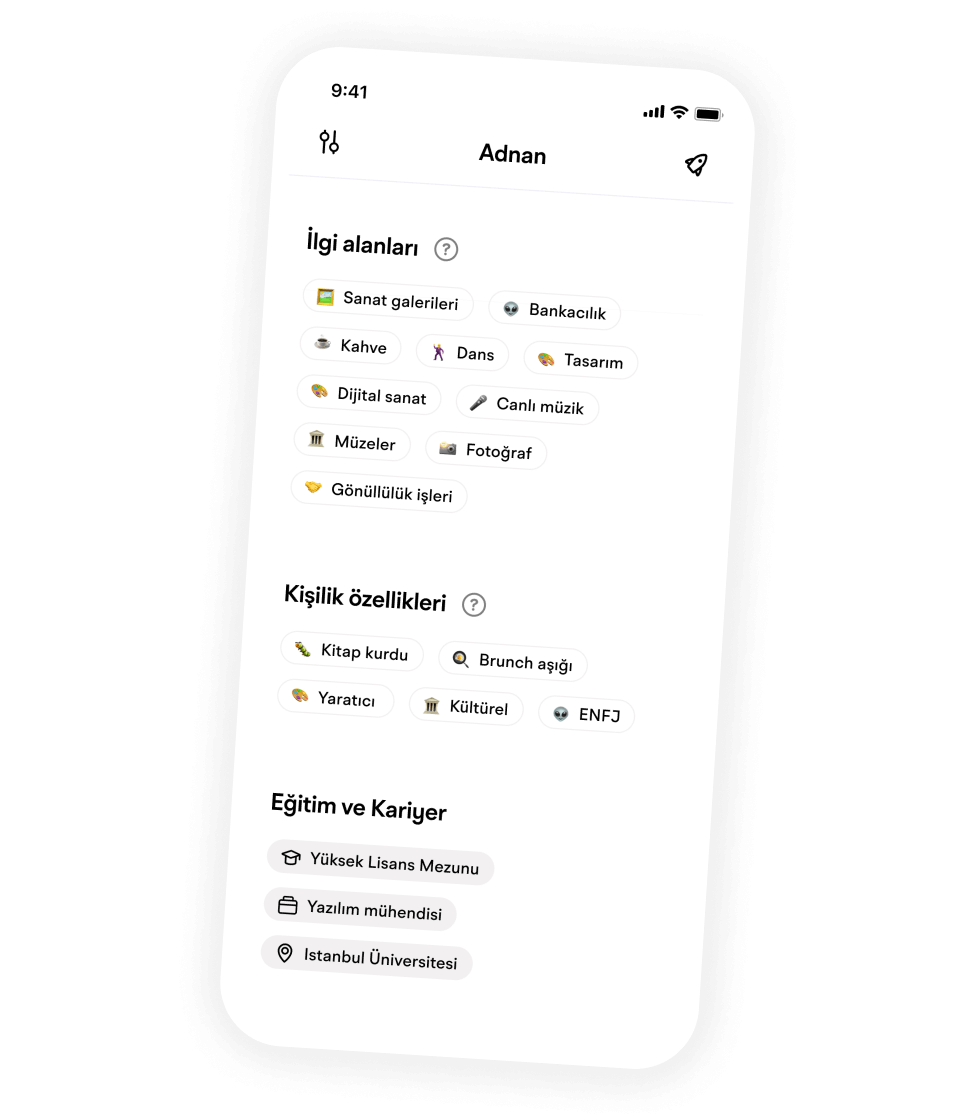 Filmlerden hoşlanır mısınız? Peki ya, gönüllü işler sizin için önemli mi? Profilinize İlgi Alanları ve Kişilik Özellikleri ekleyerek tutkularınızı paylaşan üyelerle hızlı bir şekilde bağlantı kurabilirsiniz.